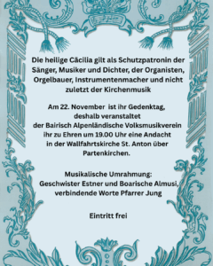 « Alle VeranstaltungenDiese Veranstaltung hat bereits stattgefunden.Andacht zu Ehren der Hl. Cäcilia22. November um 19:00« Wirtshaussingen mit der Mühldorfer Wirtshausmusi`s Jahr draaht si aussi » Zum Kalender hinzufügen Google Kalender iCalendar Outlook 365 Outlook Live Details Datum: 22. November Zeit: 19:00 2025-10-26Gertrud Woernle