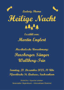 « Alle VeranstaltungenDiese Veranstaltung hat bereits stattgefunden.“ Heilige Nacht“ in Sachsenkam21. Dezember 2025 um 18:00« 45. Mühldorfer Adventsingen„Heilige Nacht“ von Ludwig Thoma » Zum Kalender hinzufügen Google Kalender iCalendar Outlook 365 Outlook Live Details Datum: 21. Dezember 2025 Zeit: 18:00 2025-12-17Gertrud Woernle